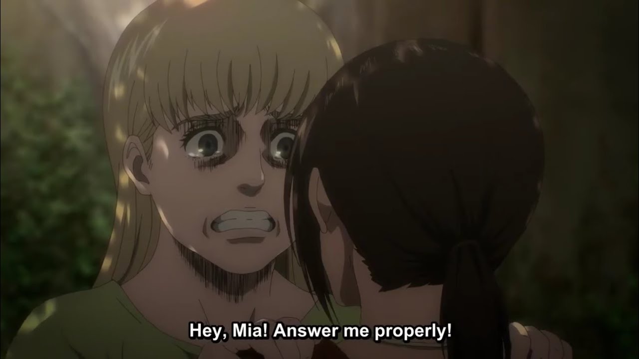 Εκτός από αυτήν την έξυπνη και πολύ καλά στημένη ανατροπή, η σειρά μας προετοιμάζει για ηθικά διλήμματα που έχουν να αντιμετωπίσουν η Gabi και ο Falco, καθώς γνωρίζουν το νησί και τους Eldians καλύτερα. Βλέπουν ότι οι αποκαλούμενοι δαίμονες δεν είναι και τόσο πολύ δαίμονες και αυτό γίνεται αντιληπτό περισσότερο από τον Falco, παρά από την Gabi. Η Gabi είναι το αντίστοιχο του Eren όσον αφορά το θέμα της εκδίκησης, όμως έχει πάθει τέτοια πλύση εγκεφάλου (που θυμίζει πολύ την αντίδραση του Reiner στο επεισόδιο 2 αυτής της σεζόν) που δεν βλέπει ότι δεν έχει ουσιαστικούε λόγους για να αναζητεί εκδίκηση. Ο Falco από την άλλη, δείχνει πολύ πιο λογικός από εκείνη και ήδη αρχίζει και βλέπει το παράλογο της κατάστασης.