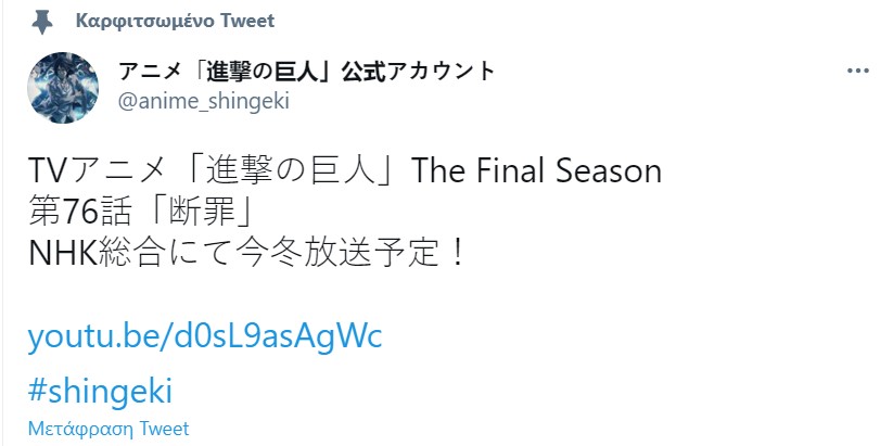 Σήμερα προβλήθηκε το 75ο (συνολικά, 16ο για την σεζόν) επεισόδιο του Attack on Titan, το οποίο μέχρι πριν λίγο θεωρούνταν το τελευταίο. Ωστόσο σύντομα μετά την λήξη του, ο επίσημος λογαριασμός της σειράς στο twitter ανακοίνωσε πως το anime θα έχει και 76ο επεισόδιο και οι εικασίες “διαψεύστηκαν”.