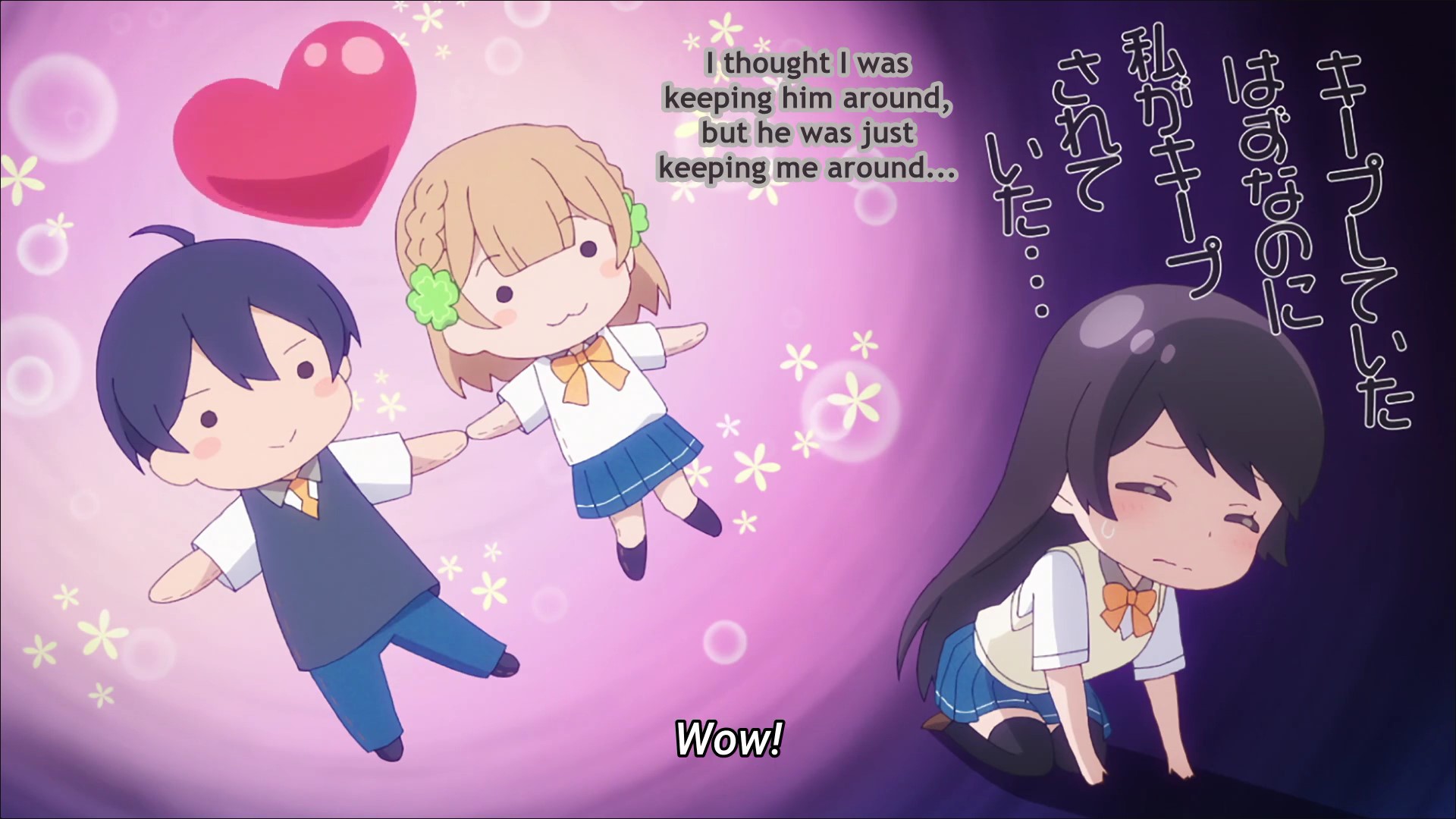 Έχουμε δύο διεκδικήτριες της αγάπης του πρωταγωνιστή (Sueharu Maru). Στην μία πλευρά βρίσκεται η διάσημη του σχολείου, λόγω της αναγνώρισής της ως συγγραφικό ταλέντο, η Shirokusa Kachi. Και την αναφέρω πρώτη, γιατί έχει κλέψει την καρδιά του και είναι η πρώτη του αγάπη. Παρότι αυτή η εισαγωγή προϊδεάζει ότι τα αισθήματα του βασικού χαρακτήρα δεν υπάρχει περίπτωση να “εισακουστούν”, το anime έχει διαφορετική άποψη. Ευθύς εξαρχής οι δύο χαρακτήρες απεικονίζονται να έχουν φιλικές σχέσεις και αποφεύγεται το κλασικό σενάριο της φημισμένης του λυκείου που δεν γυρνά ούτε να κοιτάξει τον πρωταγωνιστή. Ωστόσο δεν γίνεται ένας πρωταγωνιστής να τα έχει όλα αμέσως, αφού μαθαίνει ότι η Shirokusa έχει αγόρι ή καλύτερα δέχθηκε πρόταση για ραντεβού από αγόρι (τον άλλον διάσημο του σχολείου). Έτσι τα όνειρά του για σχέση μαζί της διαλύονται με πικρό τρόπο. Από την άλλη πλευρά “κάθεται” η παιδική φίλη και παρηγορητής του, η Kuroha Shida. Όντας παρούσα στα δύστυχα μαντάτα αναλαμβάνει κατευθείαν δράση, όταν αντιλαμβάνεται πως ο αγαπημένος της “τα έχει βάψει μαύρα”. Στέκεται στήριγμα στην δύσκολη στιγμή του, αλλά πηγαίνει και ένα βήμα παραπέρα προτείνοντάς του μία συμφωνία, η οποία θα ωφελήσει και τους δύο. “Έλα να γίνουμε ζευγάρι και εκδικήσου την!”. Με αυτόν τον τρόπο θα έχει και η ίδια την αγάπη του, έστω και σε αυτήν την ψευδή μορφή της και εκείνος θα μπορέσει να ανακουφίσει τον πόνο του προκαλώντας όμοια αρνητικά συναισθήματα στην κλεμμένη πρώτη του αγάπη.